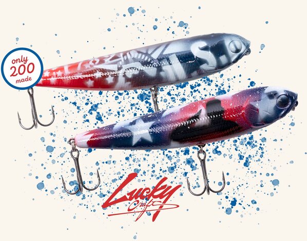 Each bait starts with the iconic Lucky Craft Sammy 115 body and is transformed by custom painter Jen Kravassi into a one-of-a-kind work of art. The patriotic red, white, and blue design isn’t mass-produced—it’s individually painted, meaning no two are exactly alike. Whether you’re a lure collector, a fan of custom paintwork, or just appreciate quality craftsmanship, this bait stands out. Only a small number were made, making it a true limited release.