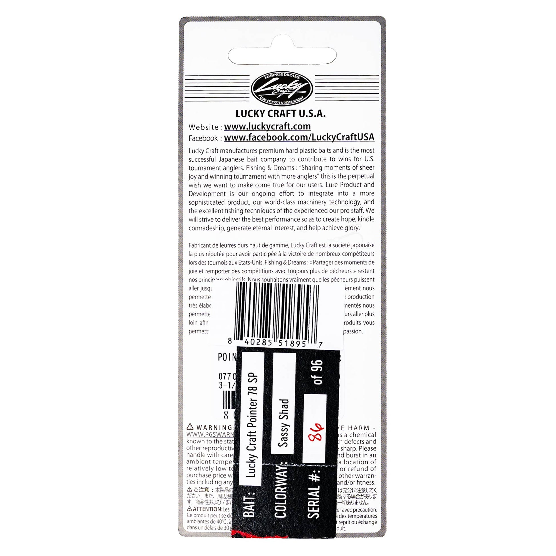 Built on the legendary Lucky Craft Pointer 78 body, this bait suspends perfectly and delivers a tight, erratic darting action that drives bass wild. The Sassy Shad colorway combines natural flash with striking detail, ideal for triggering reaction bites in both clear and stained water.